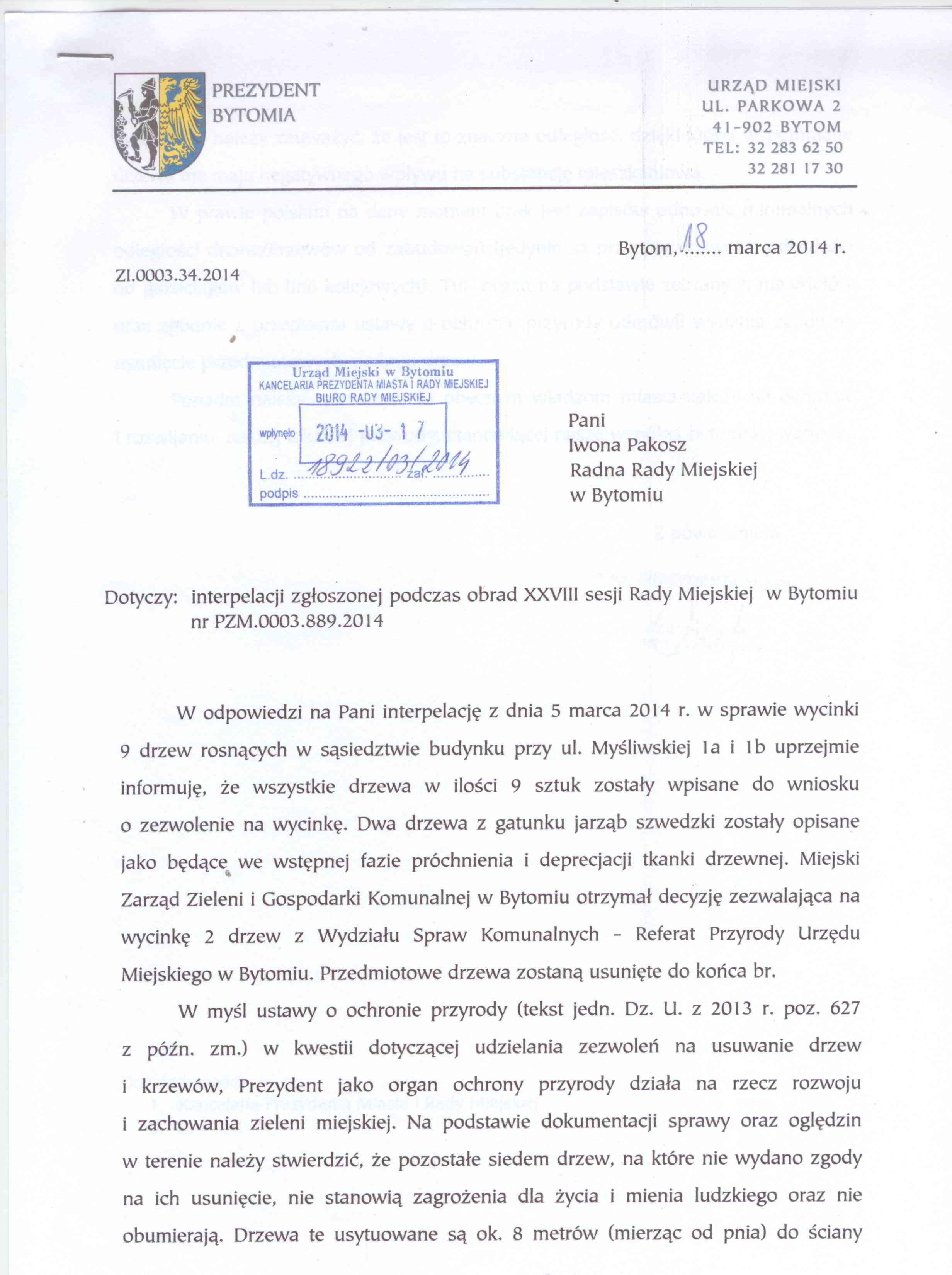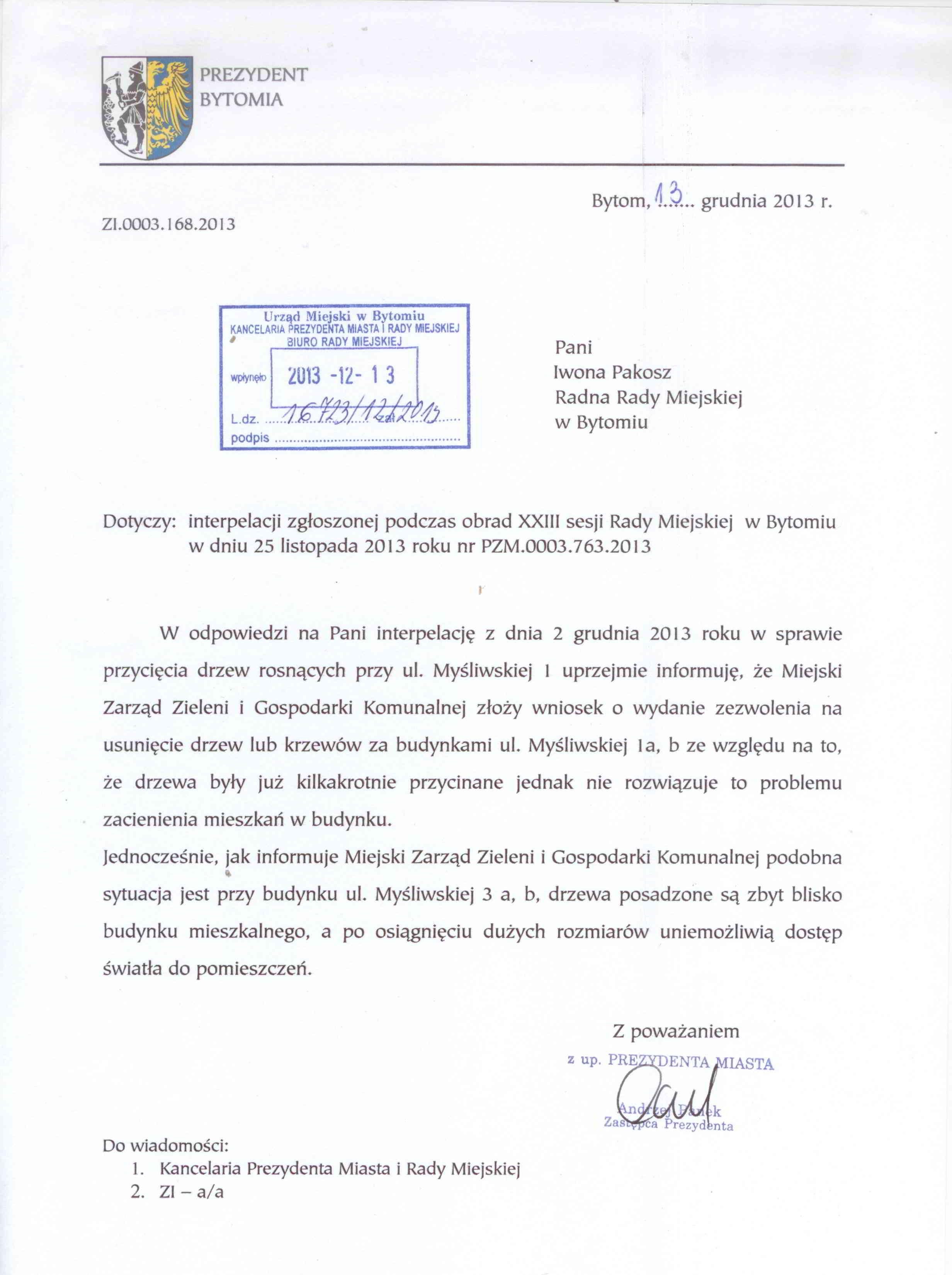 W dniu 11 grudnia 2012r. zwróciłam się z prośbą o podjęcie stanowiska ws. nieuprzątniętego terenu po Firmie „Intermot” (ul. Strzelców Bytomskich). Po mojej interwencji skierowano pismo do PINBU w Bytomiu. Pani Inspektor Kwiecińska podjęła odpowiednie czynności wobec obecnego właściciela i teren został uporządkowany.