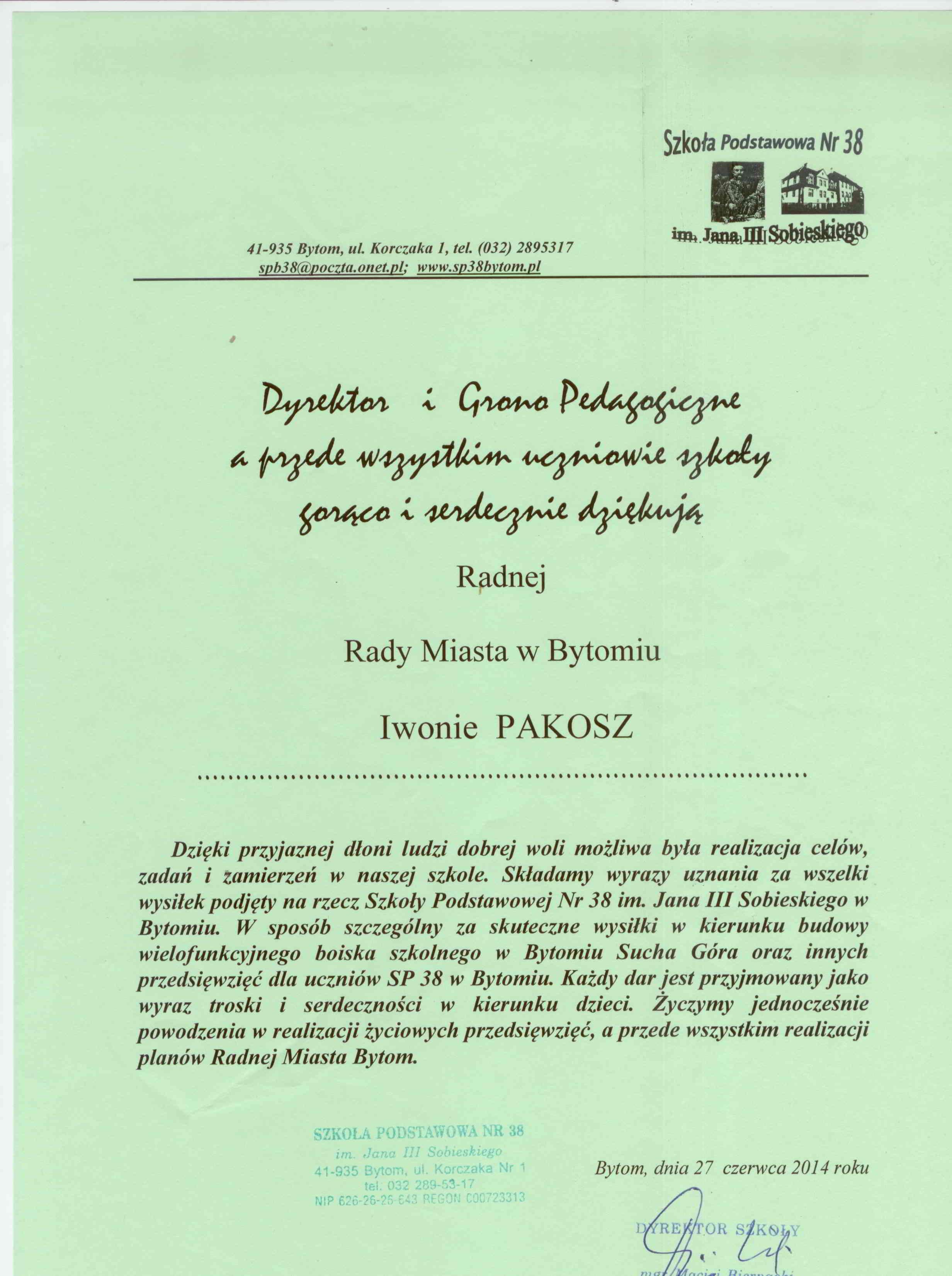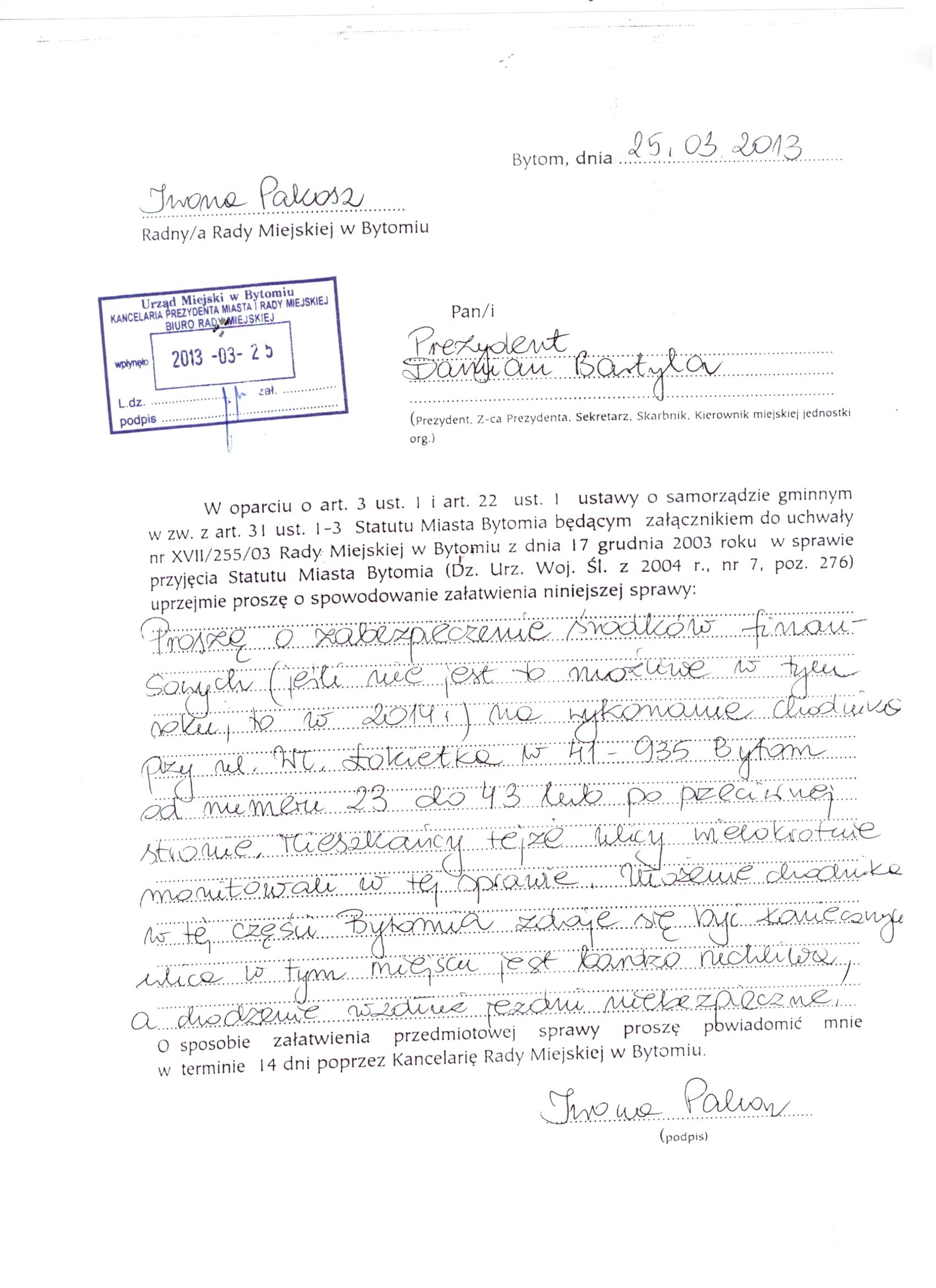 i jednostek miejskich. Oprócz tego, jako członek Komisji Finansów poddałam ten temat dyskusji podczas posiedzenia na w/w komisji. Komisja pozytywnie zaopiniowała mój wniosek. Temat boiska jest cały czas analizowany i miejmy nadzieję, że wreszcie uda się osiągnąć tak długo oczekiwany przeze mnie cel.