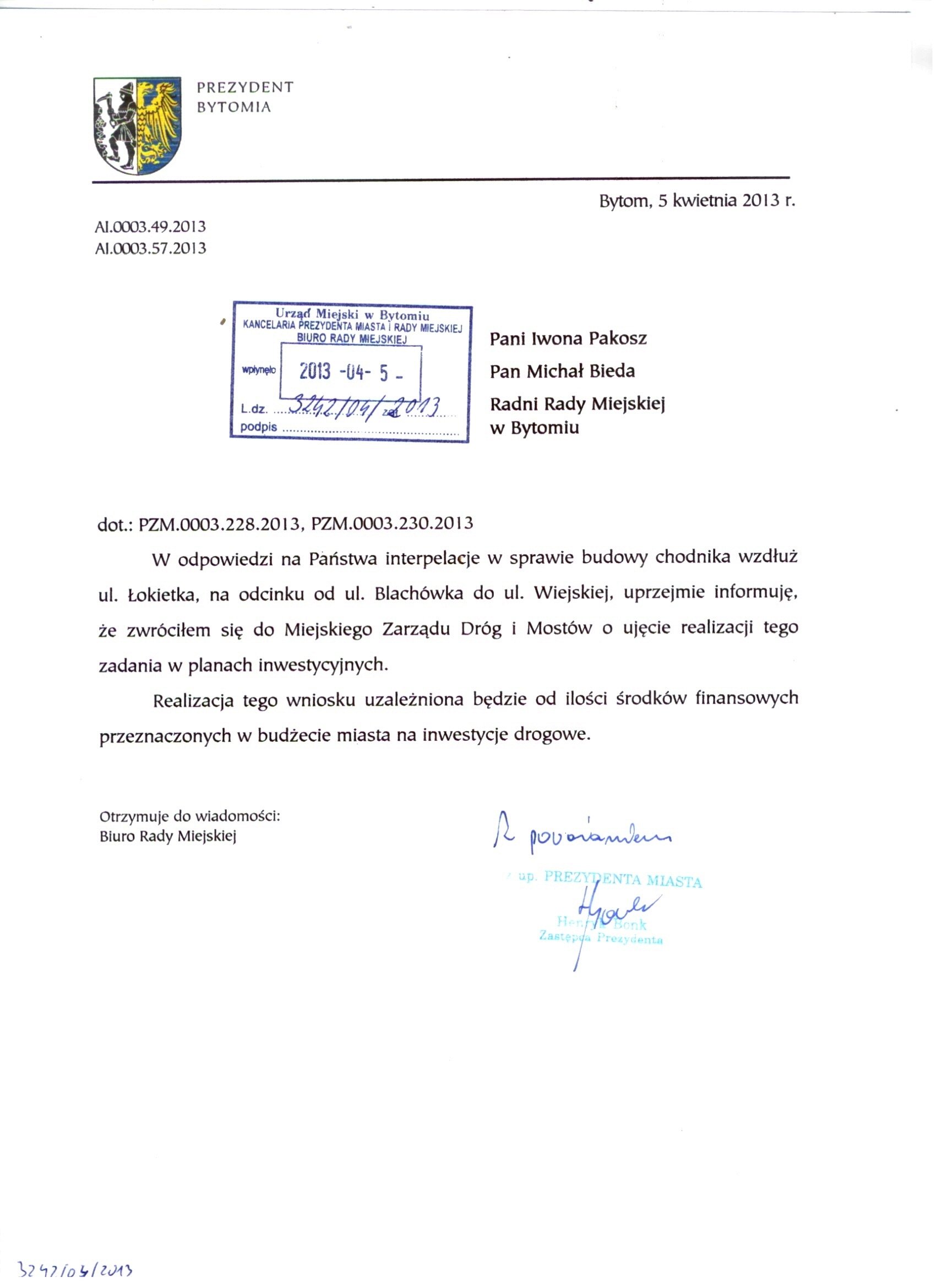 Na Osiedlu Ziętka na ulicy Hlonda jest duże zapotrzebowanie na miejsca postojowe/ parkingi. Większość mieszkańców posiada pojazdy mechaniczne, których niestety nie ma gdzie zaparkować. Napisałam interpelację w tej sprawie już w 2012r. W odpowiedzi otrzymałam informację, że opracowanie projektu nastąpi w 2013 r, a wykonanie zadania zostanie to ujęte w planie budżetowym na 2014r. Ze względu na ograniczony budżet nie udało się tego zadania zrealizować. Postanowiłam dalej drążyć temat. Doprowadziłam do spotkania przedstawicieli MZDiM z Panem Dyrektorem ds. Technicznych na czele z mieszkańcami z tej dzielnicy. Wnioski ze spotkania były jednoznaczne: miejsc do parkowania brakuje. Dlatego temat ten musi powrócić w roku następnym, co mieszkańcom obiecałam.