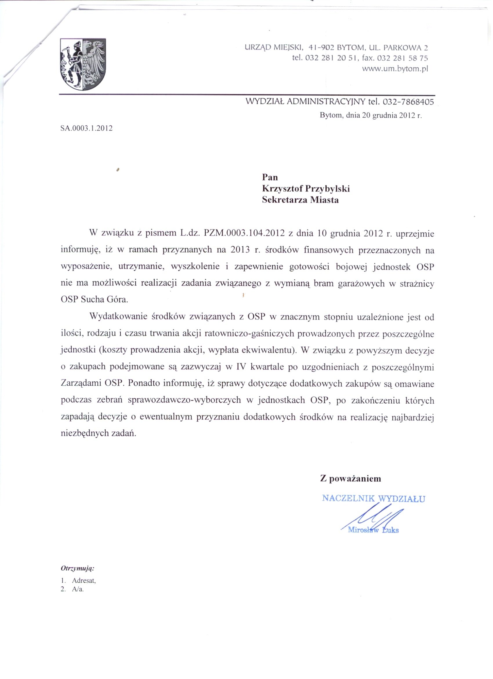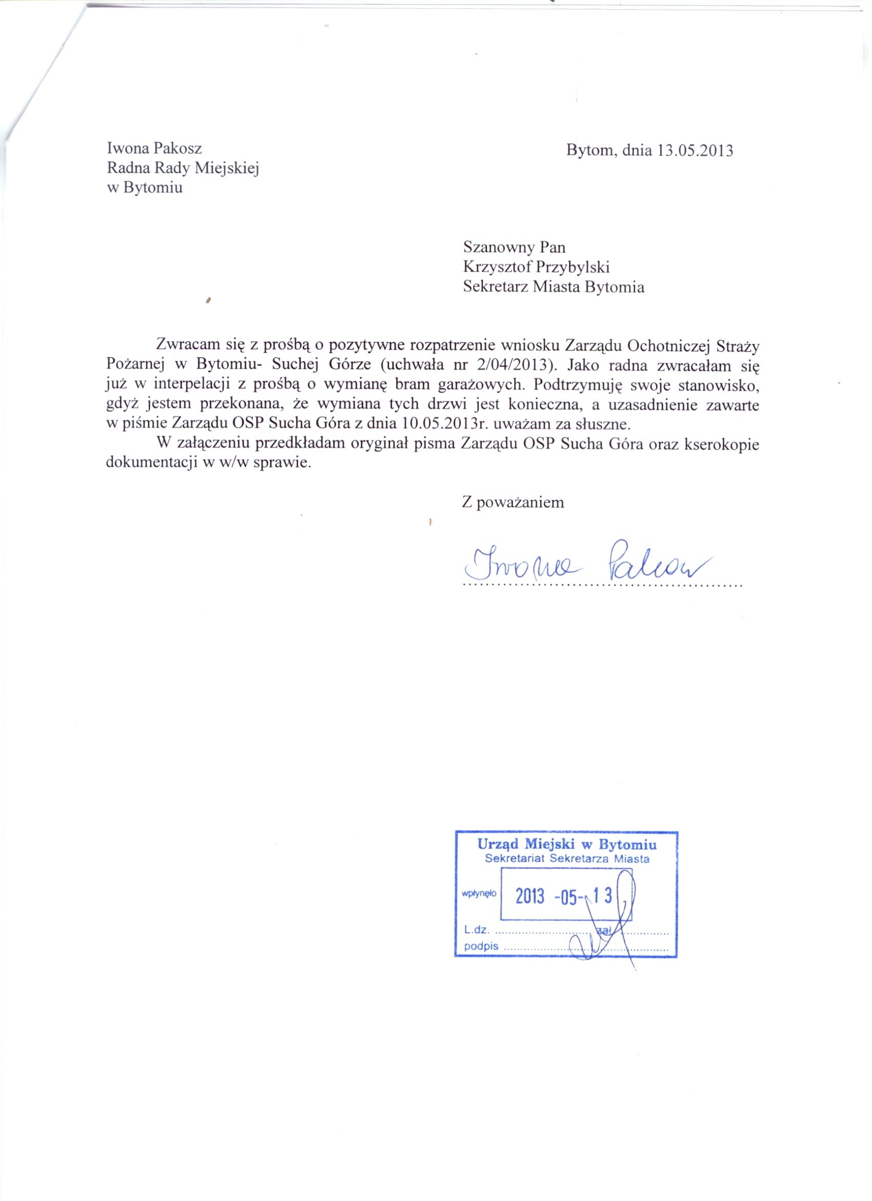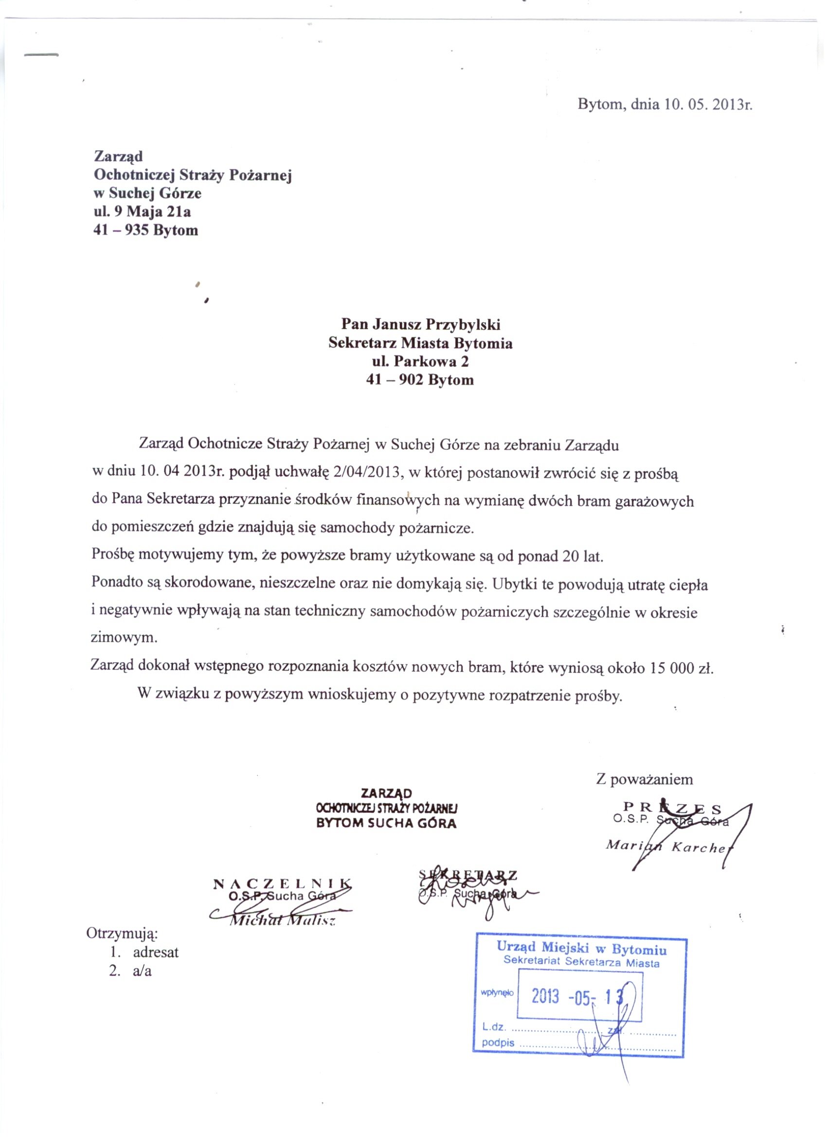 Członkowie Ochotniczej Straży Pożarnej w Suchej Górze zwrócili się do mnie z prośbą, abym pomogła im pozyskać środki na wymianę drzwi wjazdowych. Zaczęłam od napisania interpelacji w tej sprawie. Równocześnie monitowałam w tej sprawie u Pana Sekretarza Miasta oraz Naczelnika ds. Administracyjnych. Drzwi poddano oględzinom komisji ze strony Urzędu Miasta Bytom. Stwierdzono, że stare drzwi nie nadają się do użytku, gdyż mimo kilkukrotnych napraw nadal źle się otwierają, co znacznie opóźnia akcje ratownicze. Po kilku miesiącach usilnych starań udało mi się zrealizować zamierzony cel i drzwi zostały wymienione.